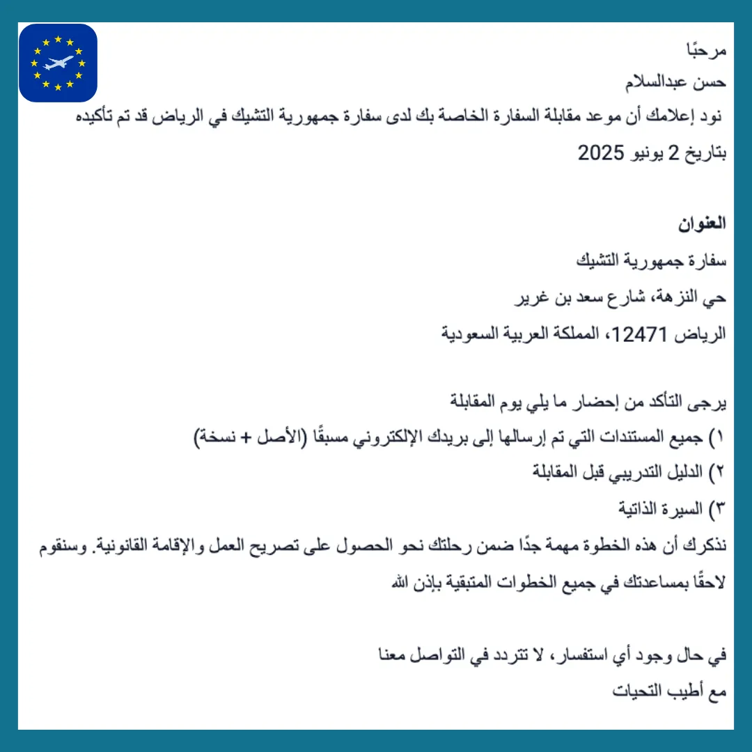 وفي حال وجود أي تأخير لأسباب قانونية أو خارجية، فريق خدمة العملاء سيكون معك أول بأول، نخبرك بكل تحديث، ونتابع معك أي متطلبات أو أوراق إضافية يتم طلبها من السفارة أو الجهات المعنية