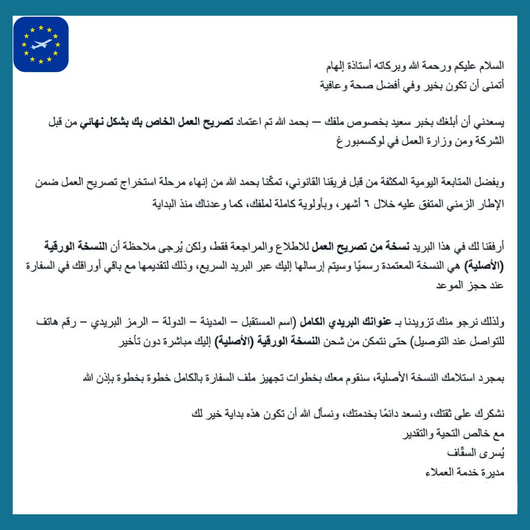 نجاحنا ما كان ليتم بدون هذا الفريق، وهم جزء أساسي من كل خطوة قانونية نمارسها، من تقديم الأوراق، إلى تنظيم المقابلات، إلى متابعة الفيزا، وكل شيء يتم وفقًا للقوانين الحديثة الرسمية في كل دولة